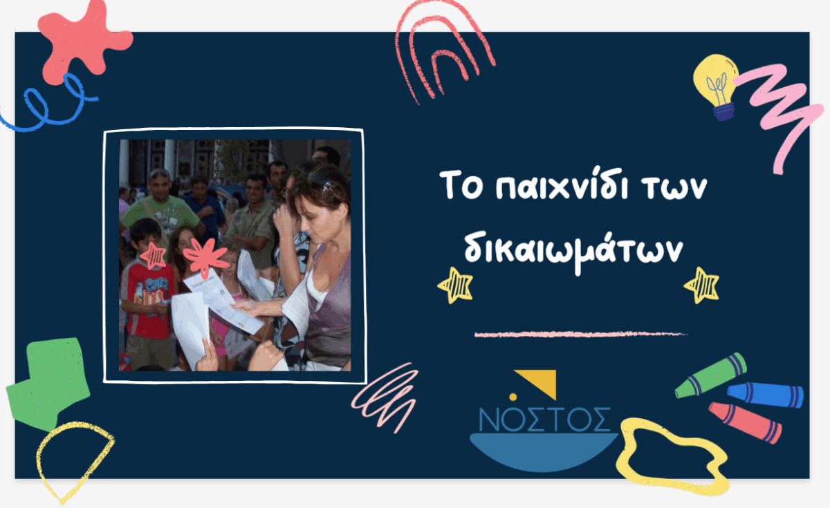 | Από την ίδρυσή του το 1995 μέχρι σήμερα ο ΝΟΣΤΟΣ ασχολείται σταθερά με την καταπολέμηση του κοινωνικού αποκλεισμού και των ανισοτήτων με έμφαση στο παιδί, στην παιδική ηλικία και στα νεαρά άτομα και στόχο την έμπρακτη υλοποίηση των δικαιωμάτων και την πλήρη συμμετοχή όλων στην κοινωνία. 20 χρόνια πριν ο ΝΟΣΤΟΣ δημιούργησε το “Παιχνίδι των Δικαιωμάτων – Τί χρειάζεται ο Σαφάρ για να μεγαλώσει όπως όλα τα παιδιά;” για να διευκολύνει τη μάθηση στο αντικείμενο των δικαιωμάτων του παιδιού με βάση τη Σύμβαση για τα Δικαιώματα του Παιδιού του ΟΗΕ. Από τότε μέχρι σήμερα έχουμε παίξει το παιχνίδι σε σχολεία, πλατείες, πάρκα και εκδηλώσεις σε όλη την Ελλάδα. Δείτε περισσότερα στο |